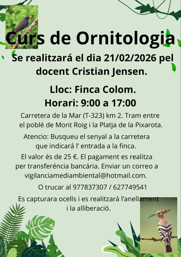 El lloc escollit per dur a terme el curset és a la finca Colom (sota el mas de la Tira, baixant per la carretera de la Mar (T-323). Pujant de la mar, seria el Km 2. L’horari serà de 9 del matí a 5 de la tarda i el professor serà el Sr. Cristian Jensen, ornitòleg. Hi haurà un senyal a la carretera on s’indicarà l’entrada a la finca on es desenvoluparà dit curset.