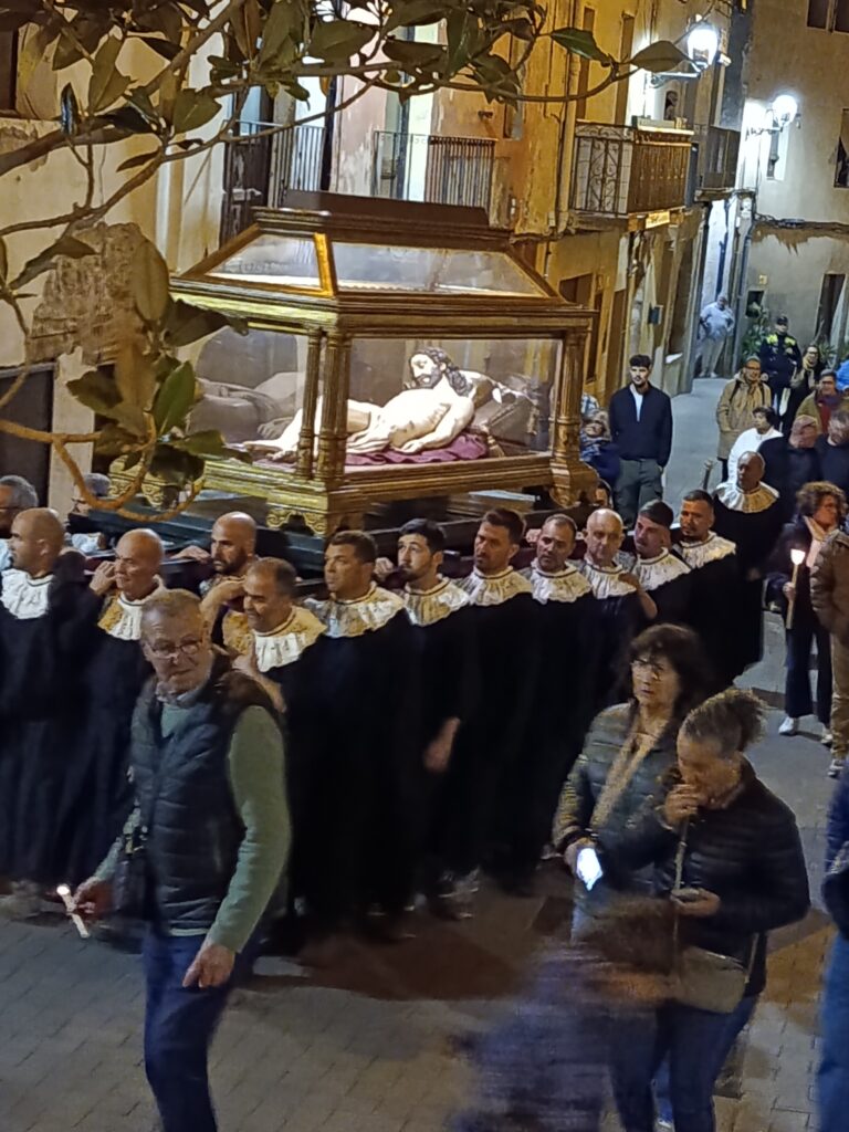 Fora del poble no és gens coneguda la manera com els portants del Sant Sepulcre enfilen el carrer Major, salvant un important desnivell amb un pas ferm i ràpid malgrat el pes que porten a les espatlles. Una cosa que m’agrada són els sons de la processó: com els armats marquen el pas i piquen les llances, seguint el ritme del timbal, o el repertori dels músics i també les estones de silenci. I, és clar, els sons de les passes veloces i coordinades dels portants del Sant Sepulcre carrer Major amunt. També vull afegir una altra cosa curiosa: actualment el consistori no participa com a tal a la processó, i això ho respecto, però se’m fa estrany.