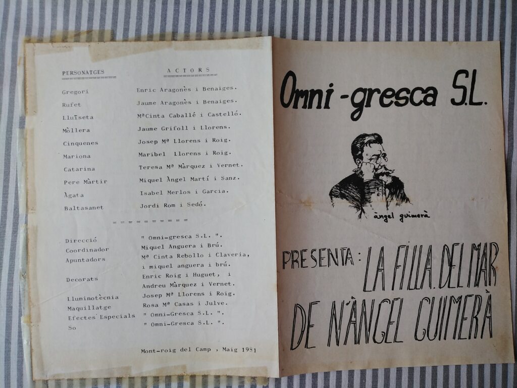 Recordo també, amb el Jaume, els anys 1980, 81 i 82, en els anys del “Cine Apte”, aquelles obres de teatre que vam presentar al Casino de Dalt, de “lo Sindicat” del carrer Major, amb el nom del grup “Omni Gresca SL”. L’obra més notòria: “La filla del Mar” del gran Àngel Guimerà, en el paper de Rufet. Era un extraordinari drama i que, en el moment culminant de l’obra, quan tocava plorar per la mort, gràcies al Jaume ens vam fer un fart de riure!! Sí, nosaltres, i tot el Casino ple de gom a gom!!