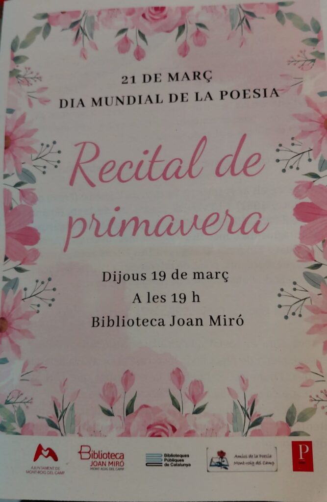 El passat 19 de març, dia de Sant Josep (fa una colla d’anys era festiu), fou el Dia Mundial de la Poesia i la Biblioteca de Mont-roig ho va voler celebrar amb la complicitat dels “Amics de la Poesia”, a l’esmentat espai, dedicant dita trobada al “Recital de Primavera”.