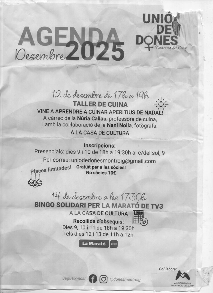 El proppassat diumenge, 14 de desembre, la Unió de Dones de Mont-roig va organitzar un bingo solidari per recaptar diners en la lluita contra el càncer, com moltes altres entitats i associacions del Principat. La Casa de Cultura Agustí Sardà aplegà molta gent fins a omplir la sala Jacint Salvadó “Cinto Quadrus” (la sala d’exposicions) i amb el bingo es va assolir la molt bonica xifra de 1.495,- €. TV3 digué al vespre que s’havien assolit, en tot el país, vora els 10 milions d’euros i, donat que es podran fer aportacions fins al 31 de març de 2026, sembla evident que es podrà superar, un cop més, la quantitat dels deu milions.