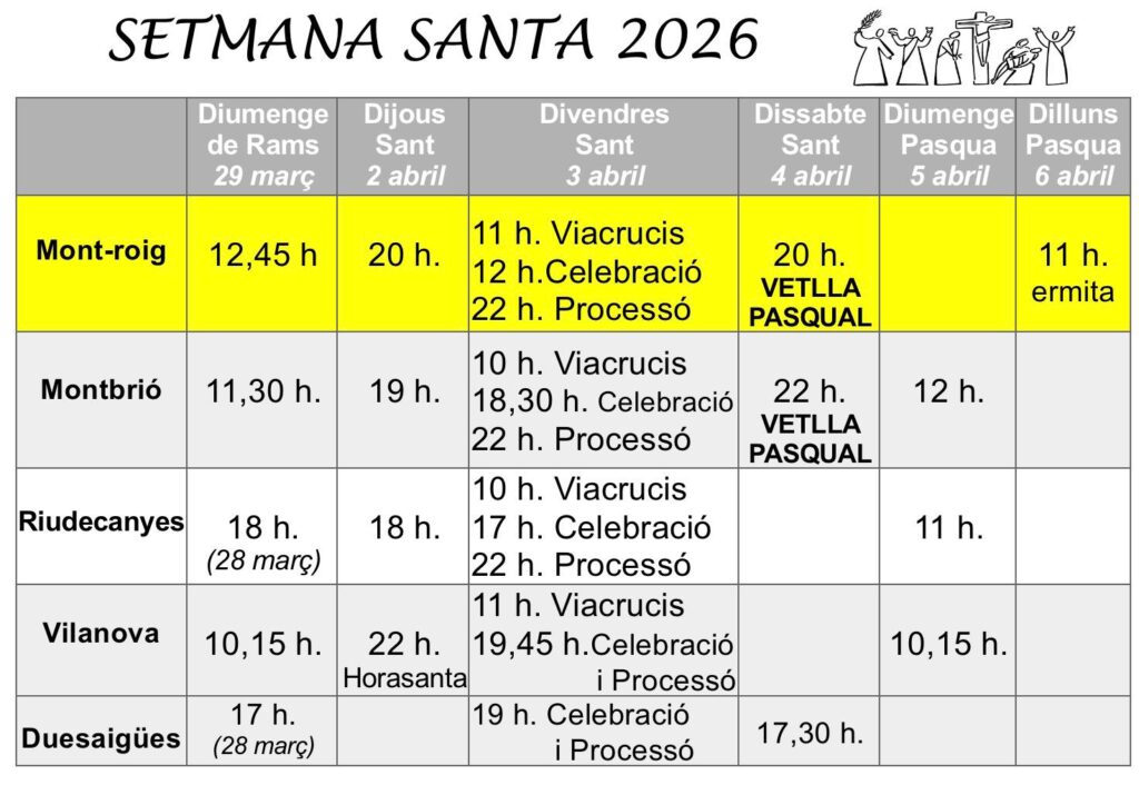 La Parròquia de Sant Miquel Arcàngel de Mont-roig ha fet pública la programació dels actes de Setmana Santa, no solament de casa nostra sinó també de les parròquies dels altres pobles d’on mossèn Amador Canaldas n’és responsable.