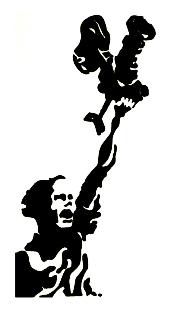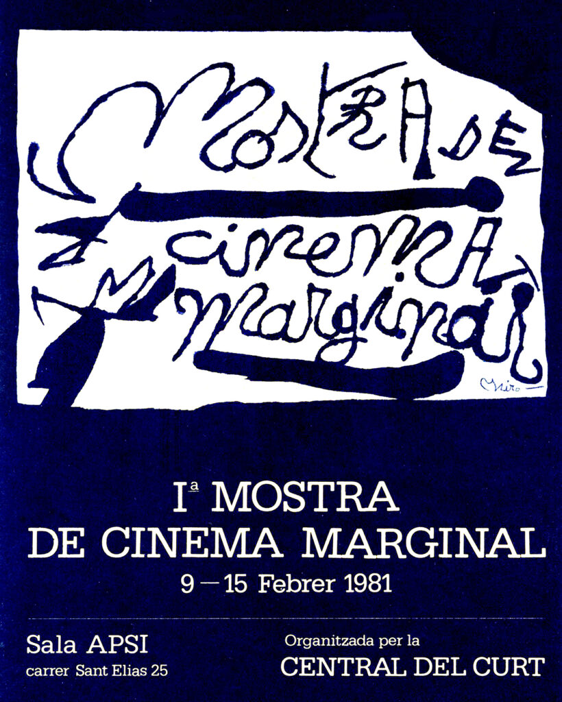 [1] Martí Rom: Li vaig demanar a Joan Miró podia fer el cartell d’aquesta mostra de cinema marginal, compromès. Em va fer arribar les dues idees que havia tingut. “És un cinema pobre”, per això la part superior dreta està “falsament” esquinçada (pintada de negre). “És un cinema de formigueta”, d’anar fent poc a poc però que aconsegueix els seus objectius; la “formigueta” és aquell traç gruixut negre que està separant la part de dalt del text de la de sota i que acaba a la dreta amb un punt rodó gros (el seu cap).